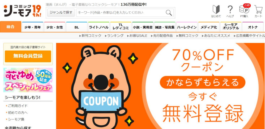 - 初回ログイン時に70%OFFクーポンが必ず貰える!